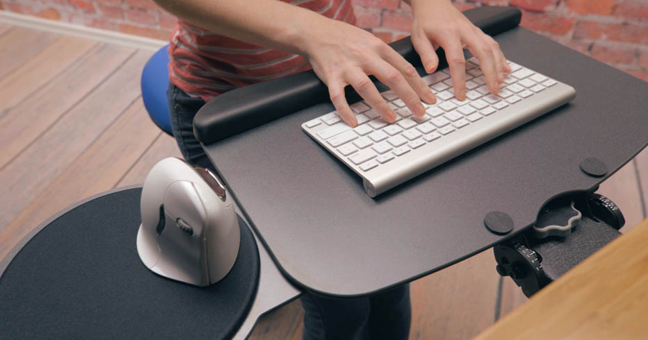 The articulated arm on standing-height keyboards adjusts up or down for each user’s comfort zone. Switching between sitting and standing reduces fatigue. The change in posture activates different muscle groups, promoting healthy movement.