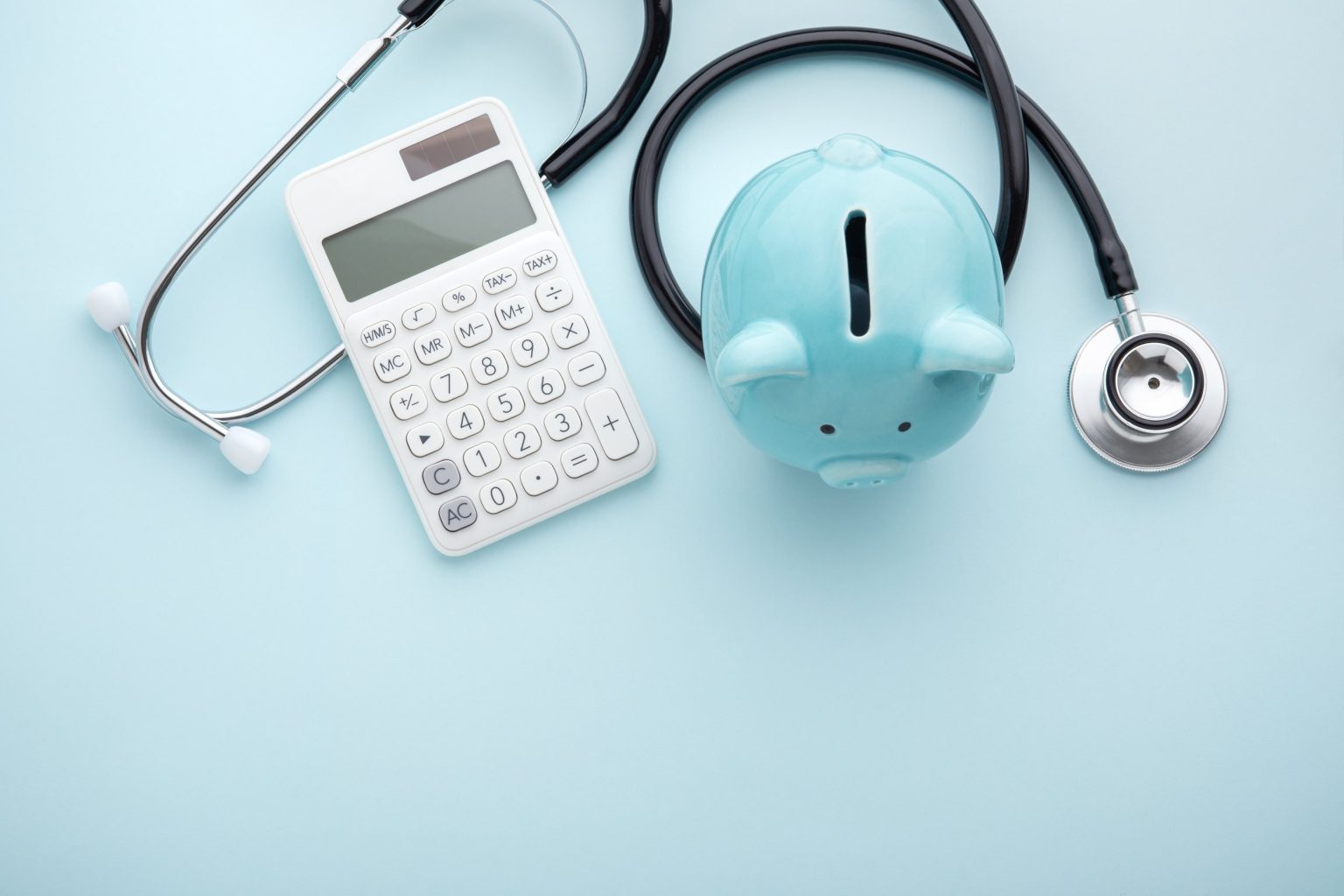 Piggy bank with stethoscope and calculator on blue background, health insurance, tax concept, with space