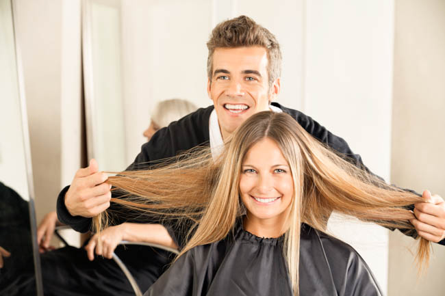 Happy male hairdresser examining female customer’s hair at salon
