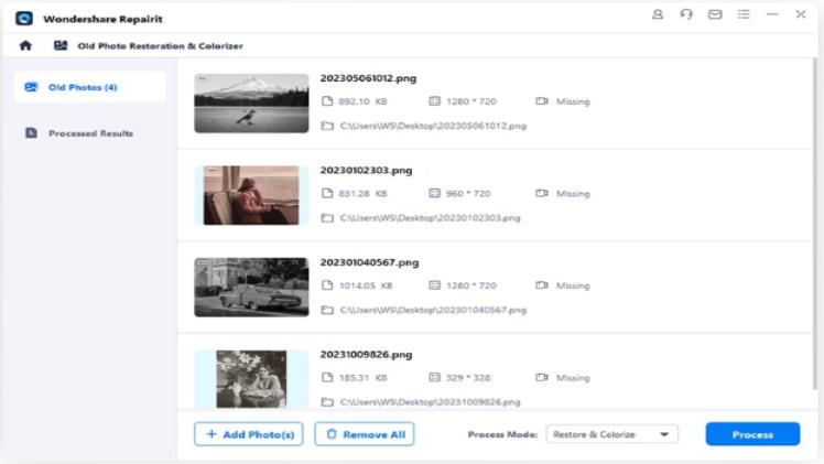 Step 2: After authenticating the submitted old photographs, please select “Process” to have artificial intelligence algorithms process your old photographs. Additionally, you can choose a mode by selecting the “Process Mode” icon.