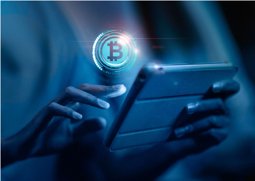 Alt text: “A futuristic depiction of a Bitcoin hologram projected above a tablet held by a person’s hands.”