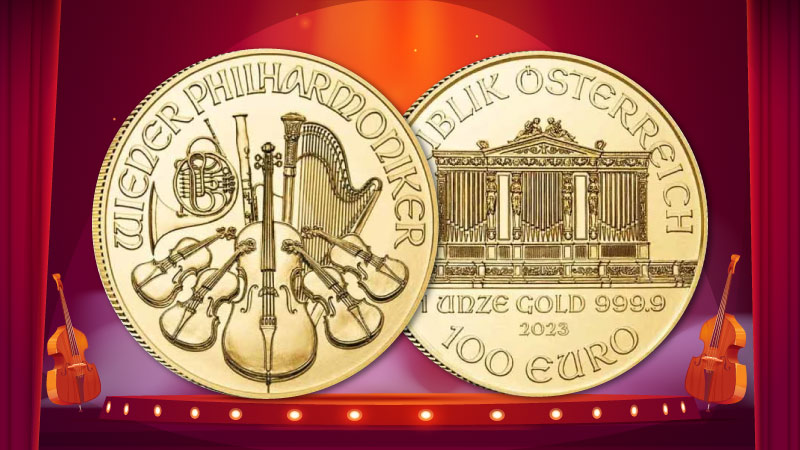 The Austrian Philharmonic gold coin represents Austria. This coin features the famed Vienna Philharmonic Orchestra and has a face value of 100 Euros.