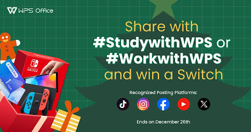 Share anything related to WPS Office on your social media with #StudywithWPS or #WorkwithWPS. WPS will randomly select 1 post to award a Nintendo Switch and officially choose 15 best posts for a 1-year WPS Pro